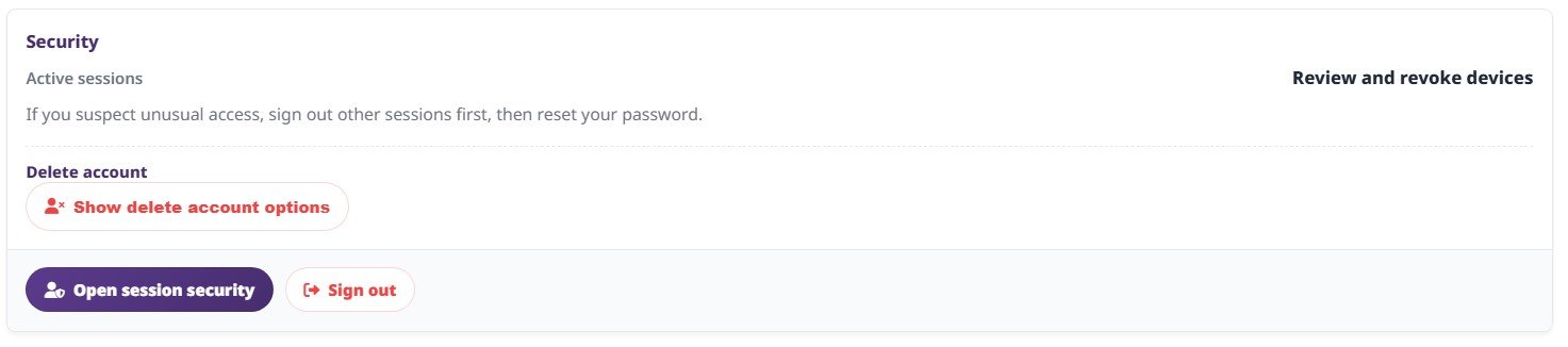 - If you suspect unauthorized access, first open Session Security and sign out other devices before deletion.